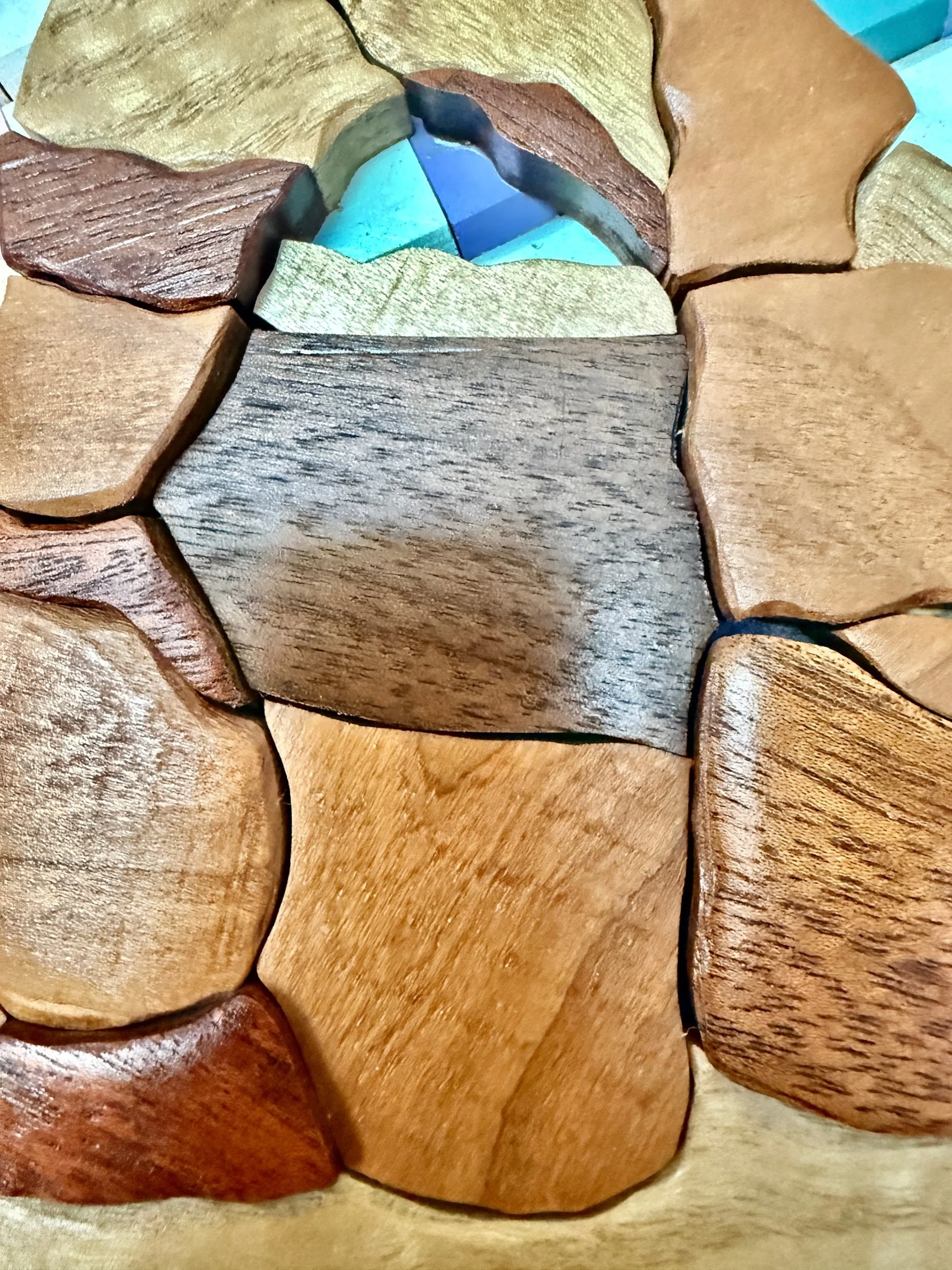This piece is made from reclaimed walnut maple mahogany cherry and oak and measures ~ 7.5”x13”