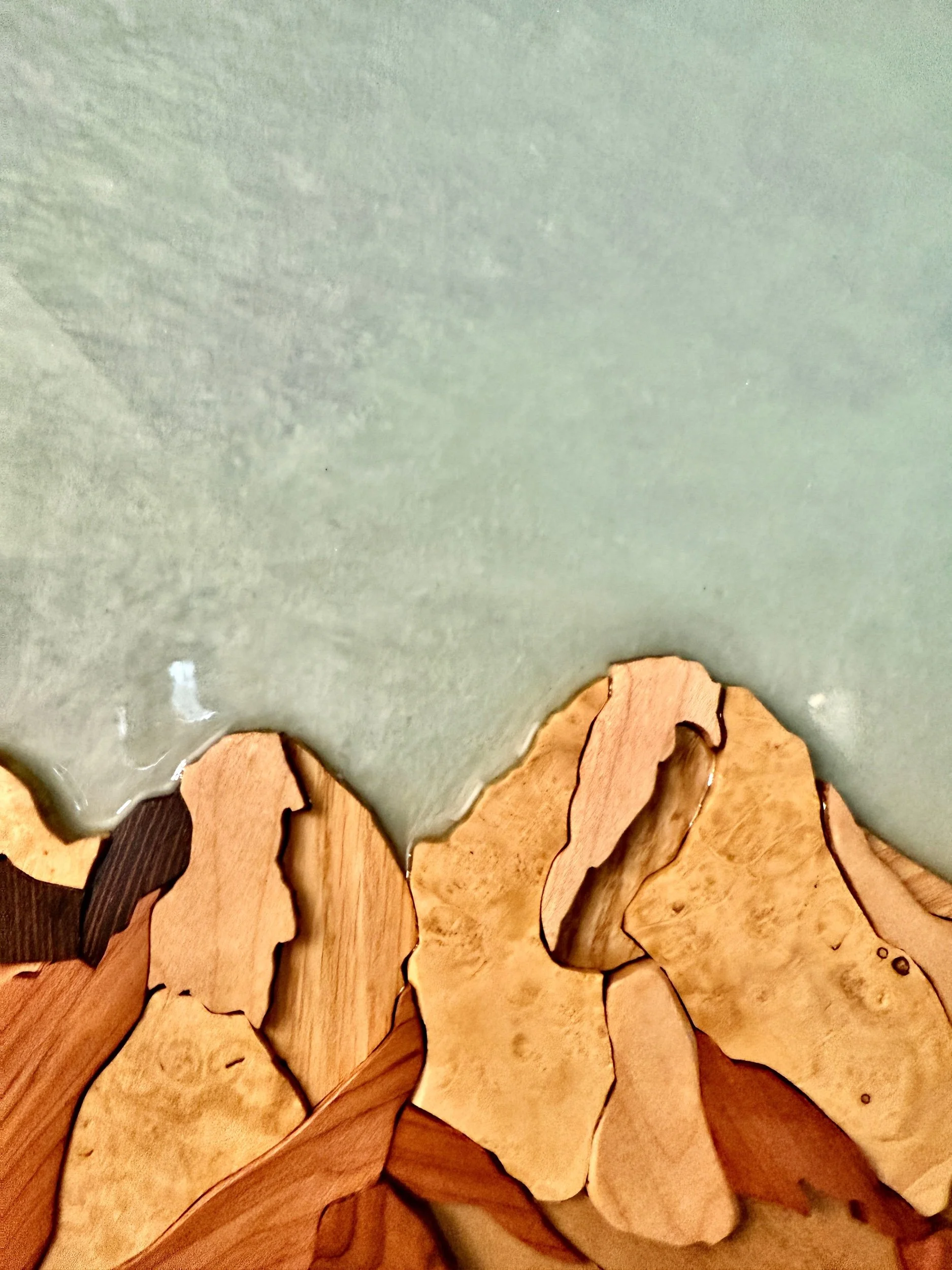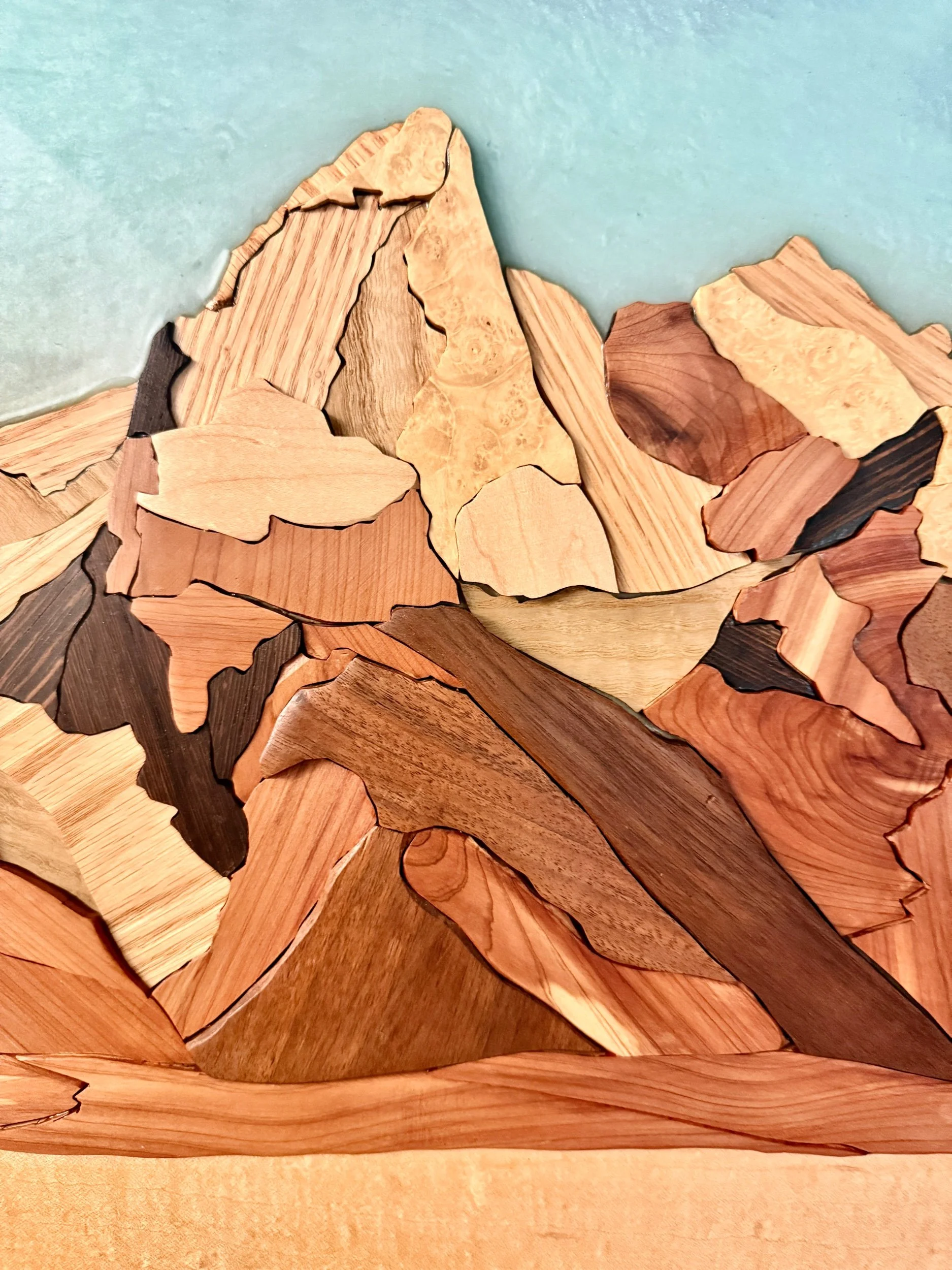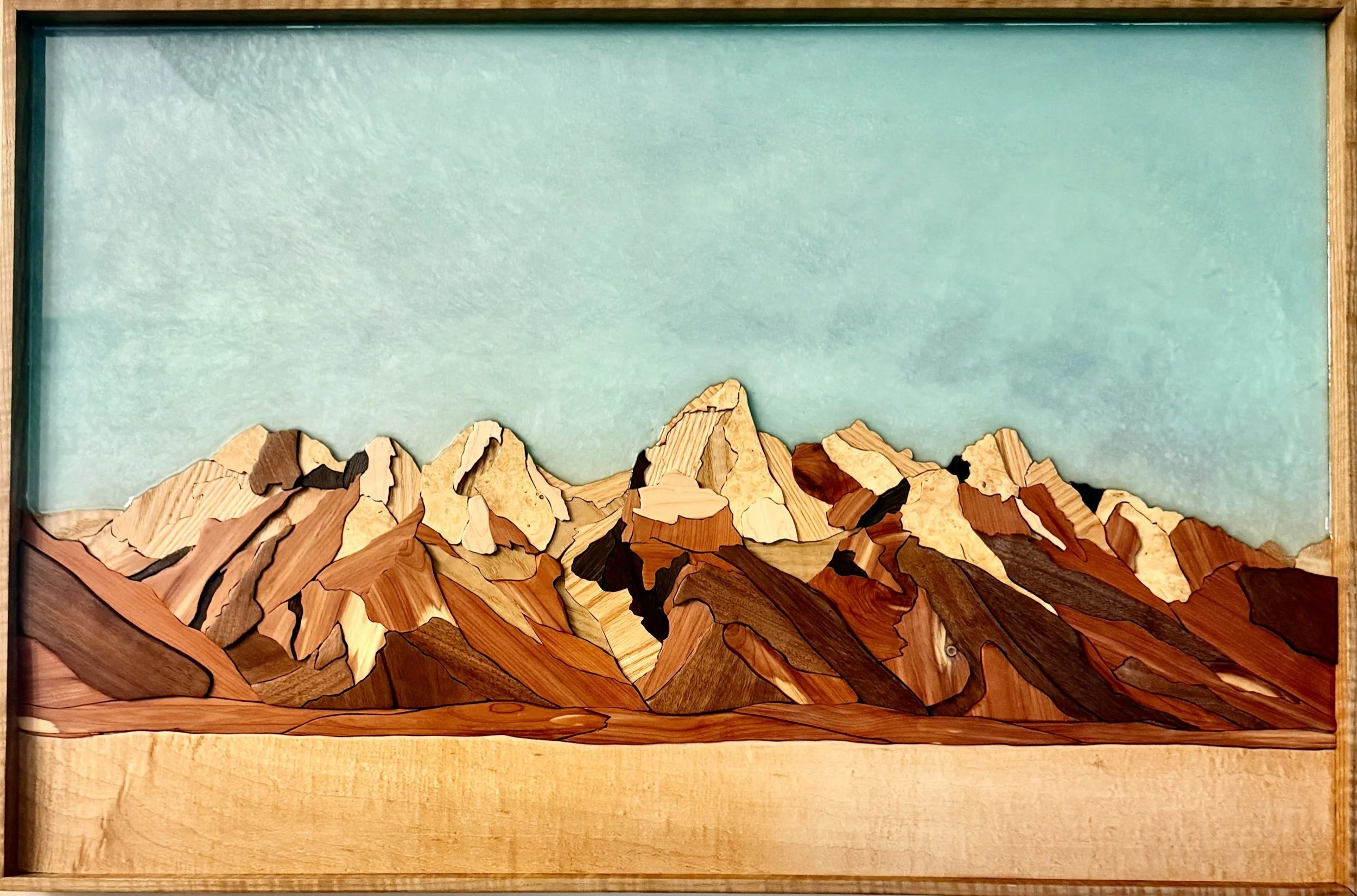Beneath the Open Sky captures the timeless majesty of the Grand Tetons in a striking blend of natural texture and luminous depth. Handcrafted from reclaimed wood and resin, this 2’ x 3’ piece bridges the rugged beauty of the mountains with a modern, glass-like finish. Each layer of resin reveals the peaks bathed in shifting light, while the reclaimed wood base brings warmth and history to the composition.