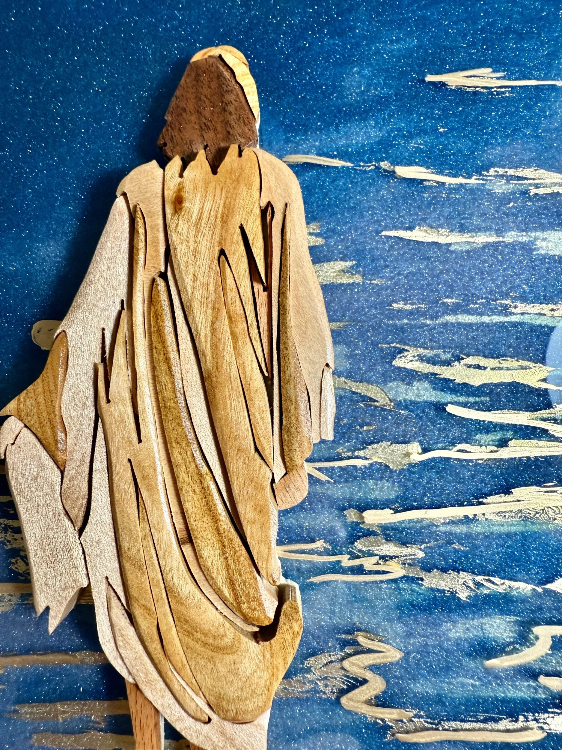 The Path of Light is a striking print inspired by an original artwork crafted from reclaimed hardwood, resin, and genuine gold leaf. This piece portrays Christ walking across shimmering water toward a waiting ship, all beneath a radiant mountain range whose reflection merges sky and sea.